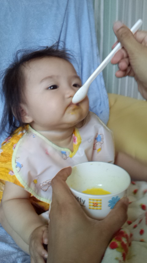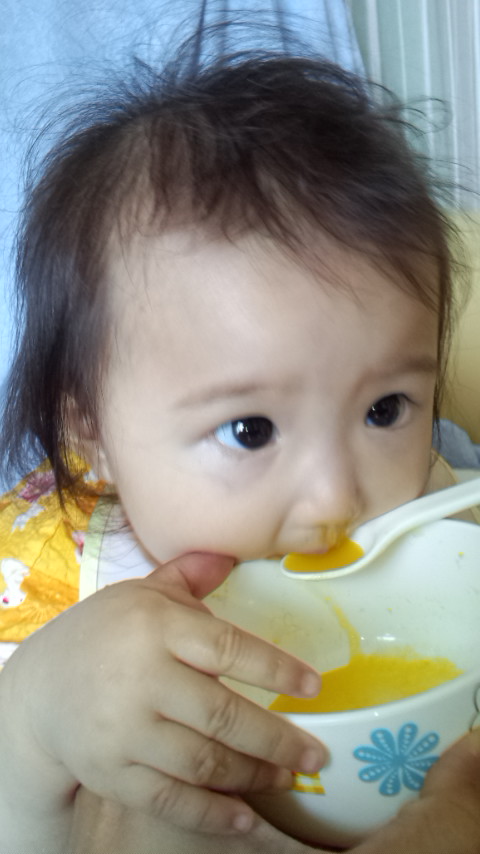 かぼちゃ粥を ちゃんと あ~ん して 食べてくれるようになりました。