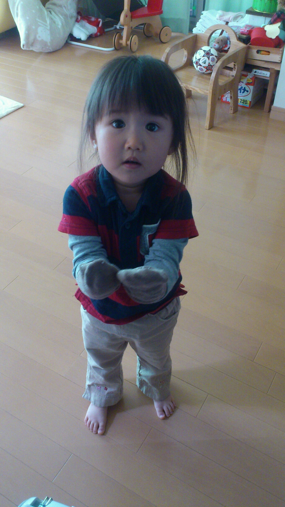 いつもなら ジーンズかスパッツ履かせてるので、大した事もなく立ち上がって 『anちゃん、ちゅよい!!!』