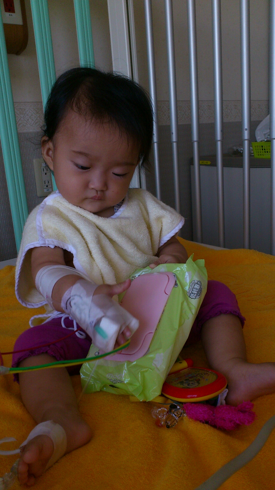 酸素計をおもちゃに、ひっぱって遊んでました。