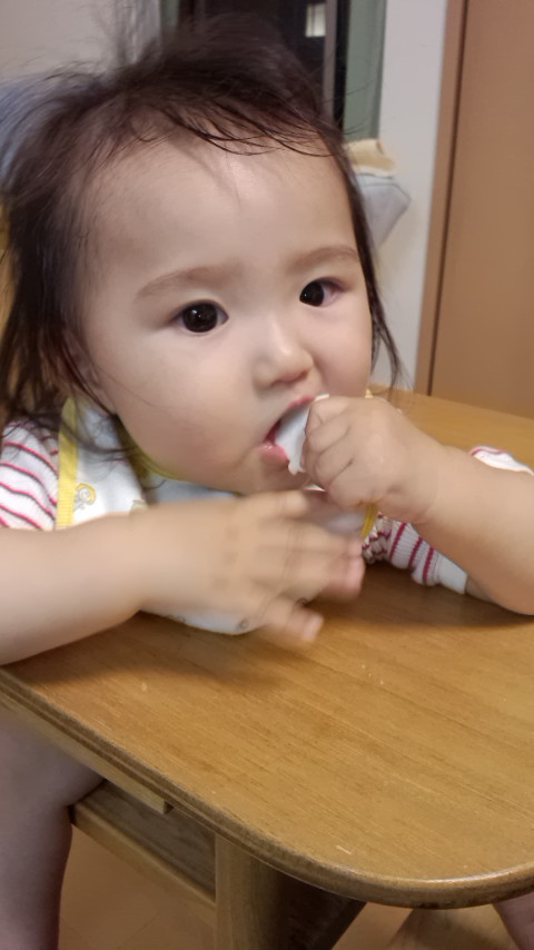 子供の食べてる姿ってめちゃくちゃ可愛いね♪私、いまだにアカチャン煎餅好きやわ(笑)あんちゃん、汗疹できてない?毎日暑いから子供も大変やなぁ!ほんで、妊婦も妊娠中体温高いから汗かく量が半端ないわ(笑)