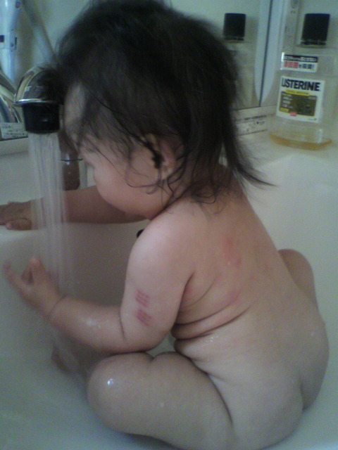 湯船では じぶんで ばしゃばしゃ やって顔中 みずびたし・・・。
