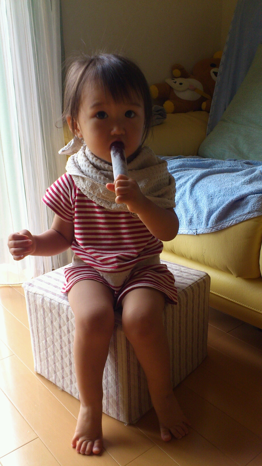 椅子の上に立って 『かたーい』