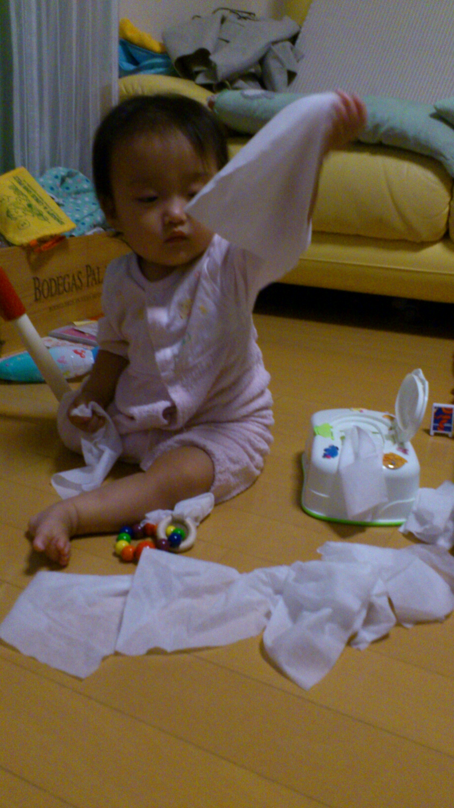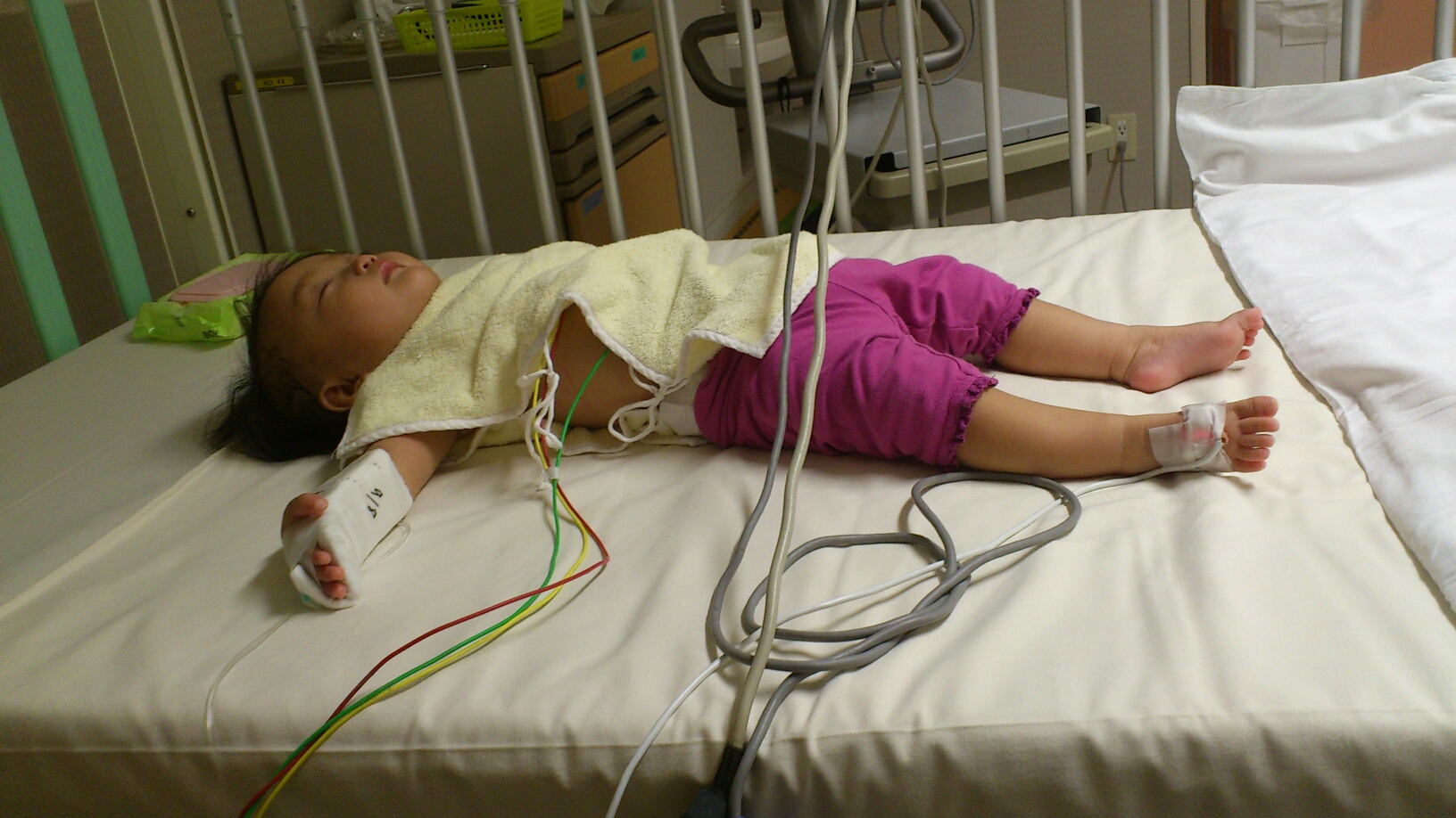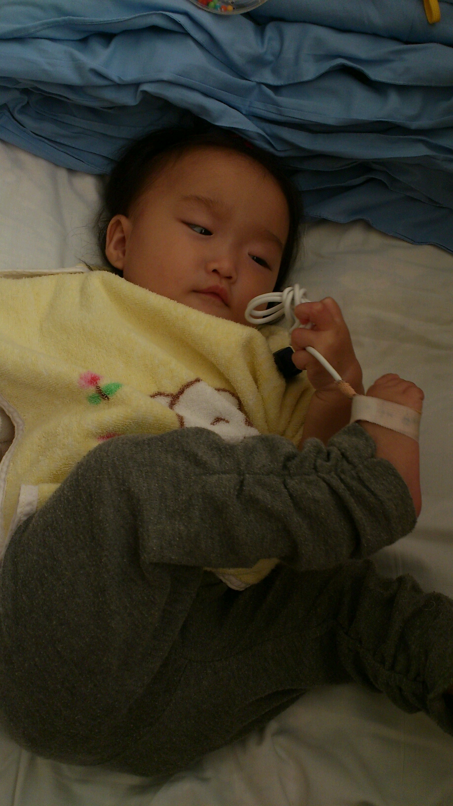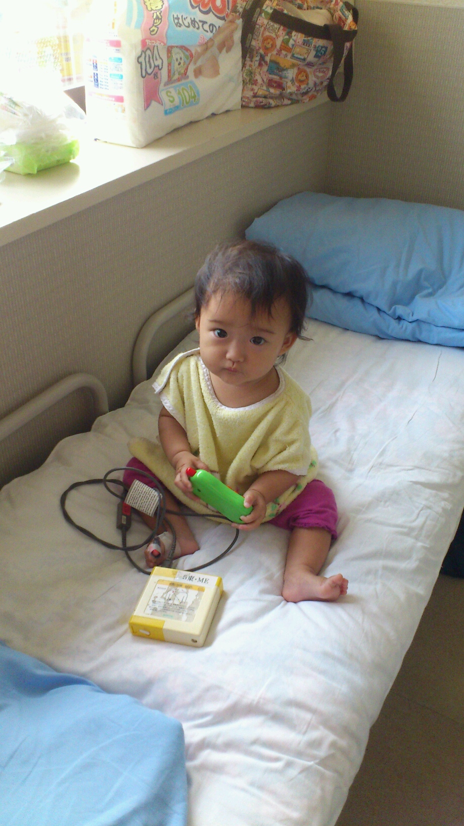 酸素計をおもちゃに、ひっぱって遊んでました。