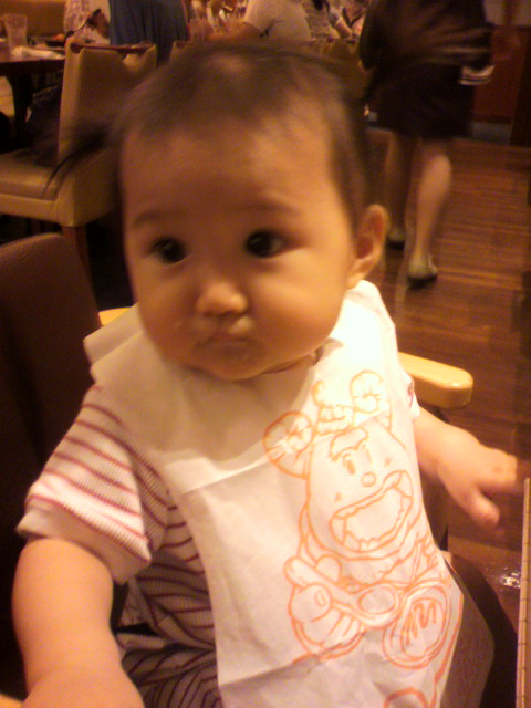 右写真: デニーズで いっちょまえに 子供椅子に座り ゴハンを待ってるAnna