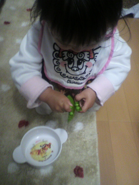 中の 豆を つまんで 食べていました。