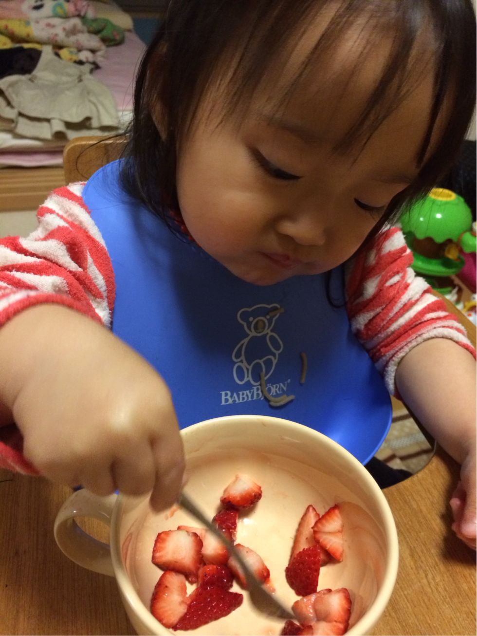 だんだん、食べるのも早くなってくるので 小さめに切って フォークを持たせたら ちまちま たべてます