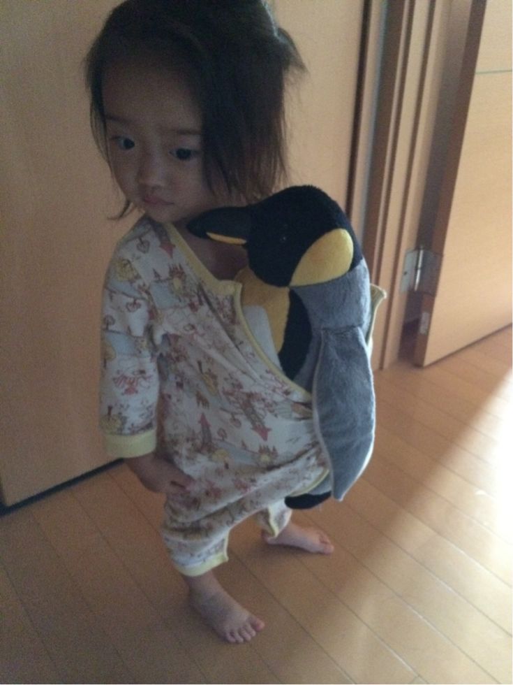 やって欲しい事が 伝わった事に安心するのか ペンギンをお腹に入れたまま