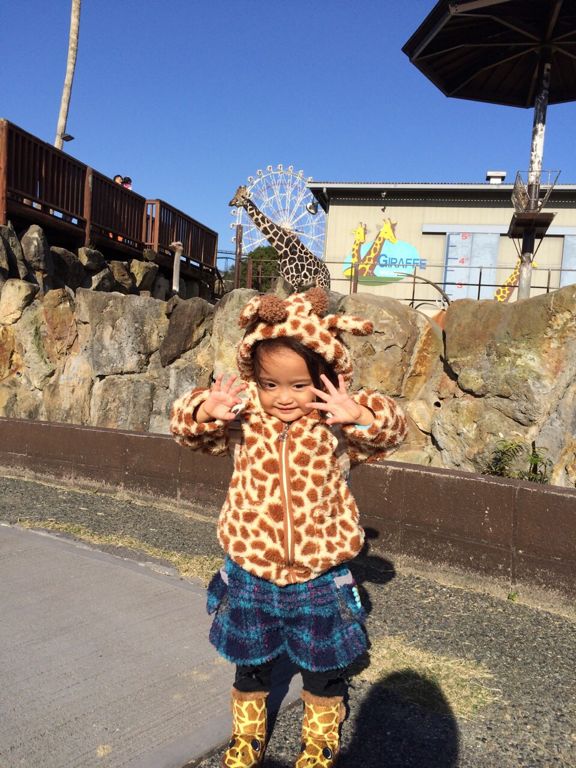 キリン柄のジャンパーにブーツ